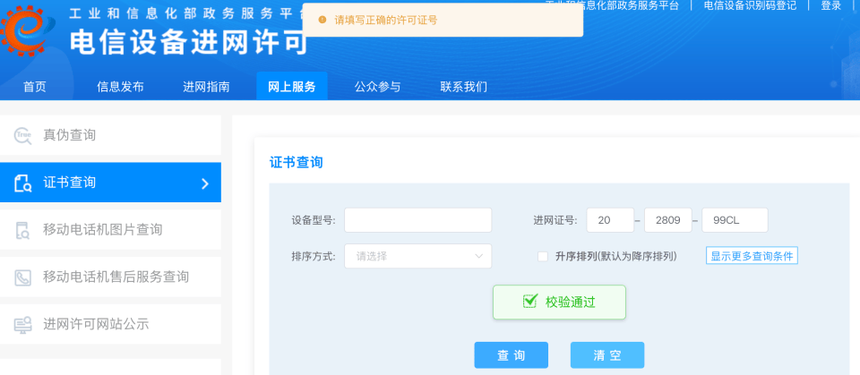 虽然每部手机背后都贴有进网许可,但不论是厂家发来的样机图片,还是投诉消费者发来的真机图片,《IT时报》记者均未在工业与信息化部电信设备进网许可网站上查到,均显示“请填写正确的许可证号”,可见这些手机均未通过国家相关部门的检测认证。