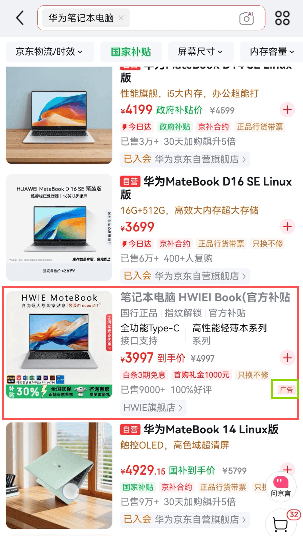 这家店铺里的详情介绍里并未出现“华为”字样,她又是如何搜到的?《IT时报》记者尝试在京东搜索“华为笔记本电脑”,一家名为“HWIE旗舰店”的店铺在首屏出现了6次,且都标有“广告”字样,其店铺详情介绍、产品页与金宏达电脑整机专营店如出一辙。