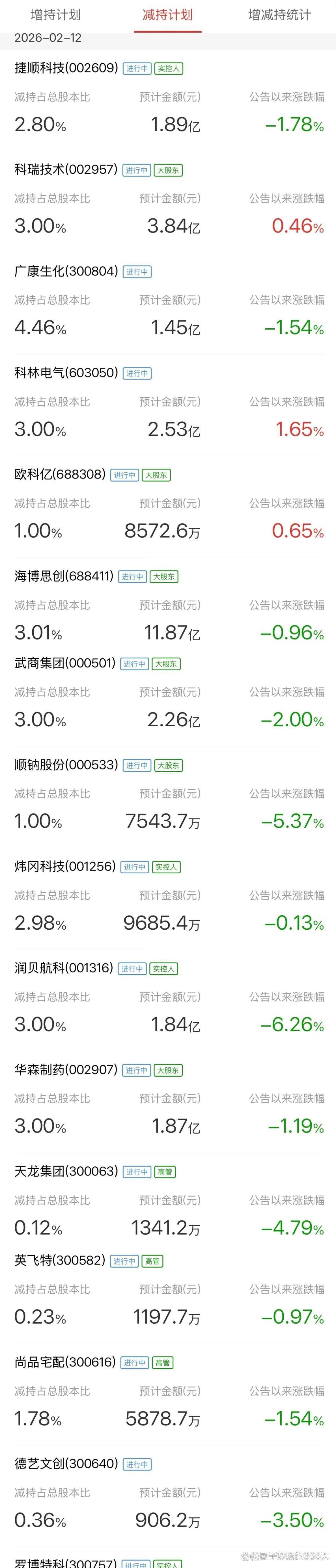 其他发布减持公告的公司还包括捷顺科技、科林电气、欧科亿、威博液压、东利机械、尚原宅配、罗博特科、利和兴、德艺文创、英飞特、三美股份和天龙集团。 这些公司多数近期股价涨幅较大,股东选择在高位减持套现。