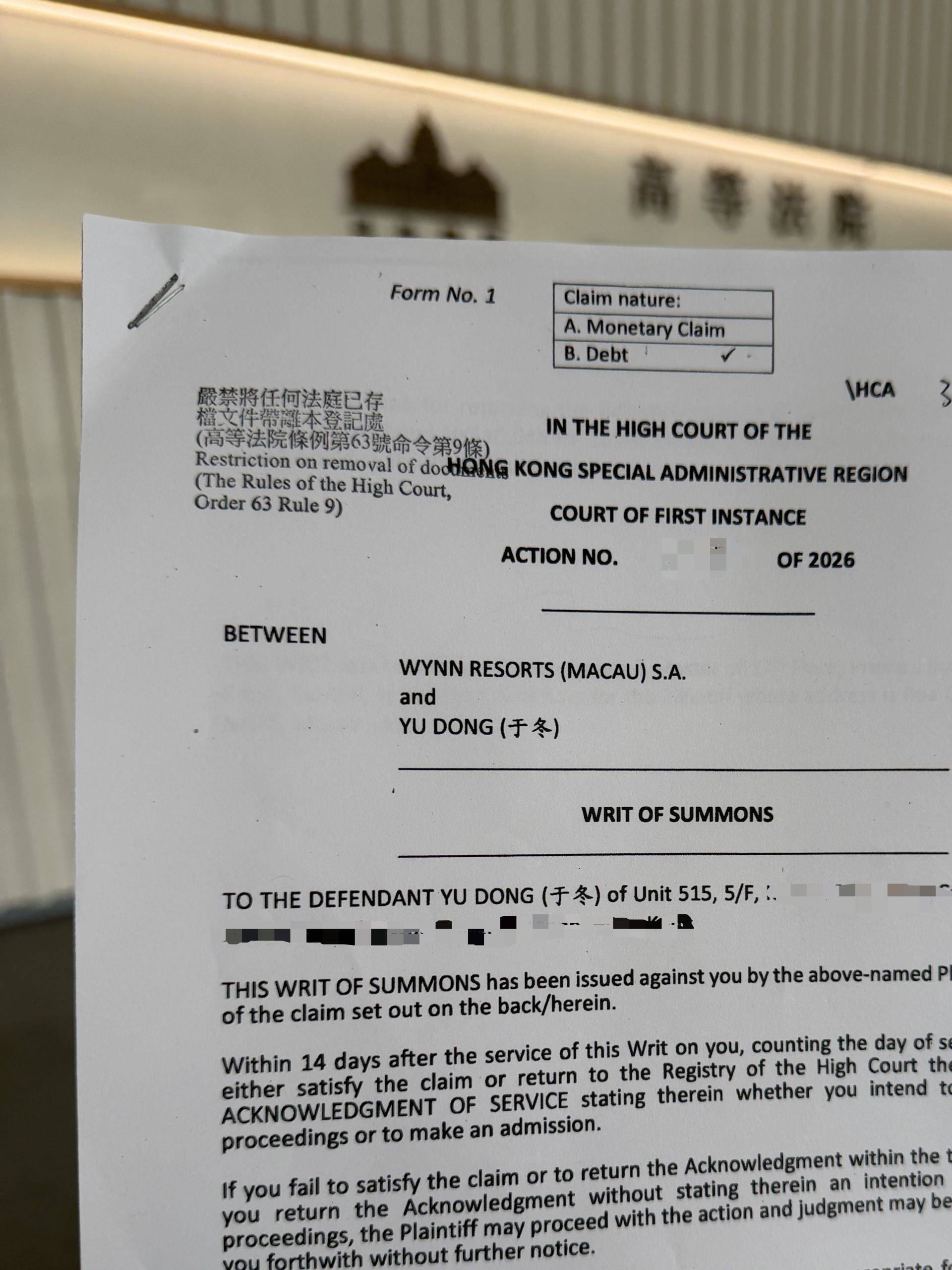 永利澳门指,于冬在该支票被拒付后,曾于2026年2月1日左右再偿还100万港元,故现时仍拖欠约473万港元本金。